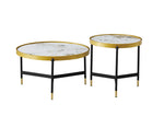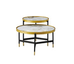 Make a breathtaking statement with the 2pc Coffee Table Set - IF 2625. This exquisite duo elevates the living space with its dramatic Pandora marble-pattern sintered stone tops, contrasted by a sophisticated two-tone black and gold steel base. The interplay of heights, rich textures, and metallic accents creates a truly luxurious focal point that is both a functional surface and a piece of sculptural art.
