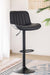 Upgrade your home seating with this stylish Set of 2 Adjustable Height Bar Stools. Featuring vertical stitching details and a sleek design, these stools offer both comfort and modern appeal. The adjustable height gas lift allows for easy customization, while the steel footrest ensures added support for a relaxing experience. With a black metal frame and durable PU upholstery in black and grey, these stools fit seamlessly into any contemporary space.